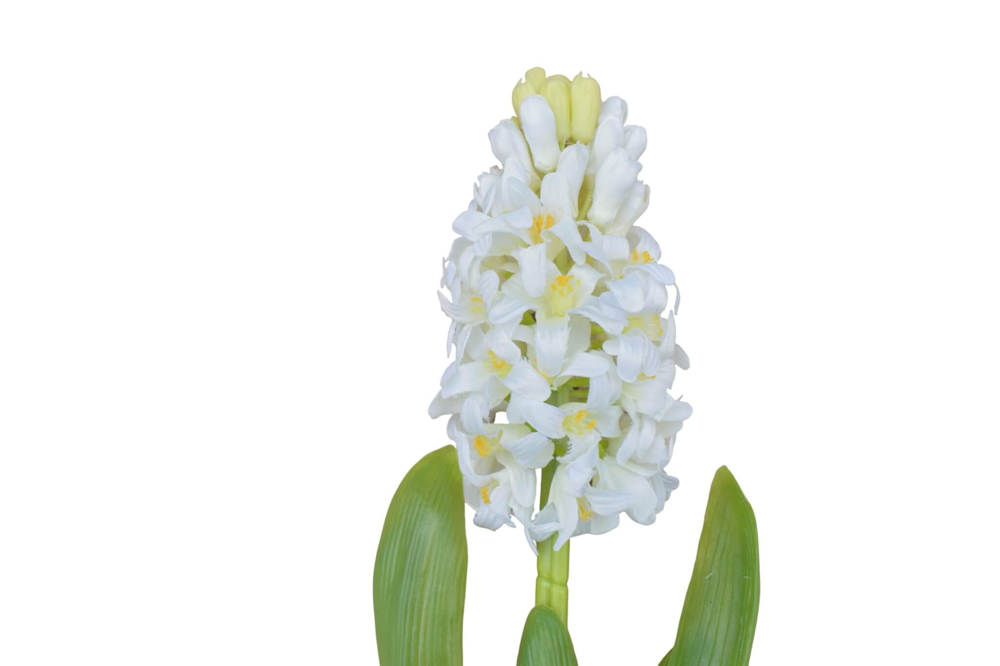 Hiacynt z liściem o wysokości 40 cm .Drobne kwiatki wykonane z materiału natomiast łodyga i liście są gumowe. Nadaje się do kompozycji wiosennych.