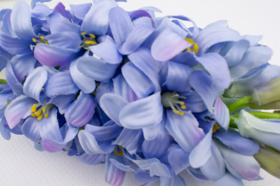 Hiacynt z liściem o wysokości 40 cm .Drobne kwiatki wykonane z materiału natomiast łodyga i liście są gumowe. Nadaje się do kompozycji wiosennych.