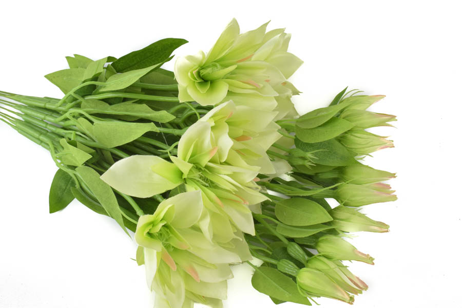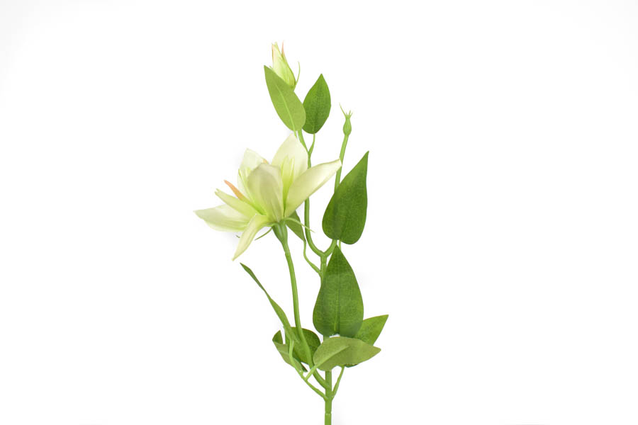 Sztuczna gałązka klematisa składająca się z jednego kwiatka i pąka zakończona drutem . Idealnie nadająca się do kompozycji całorocznych