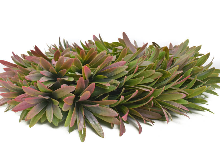 Prezentowany wieniec sztuczny wykonano z drobnych podłużnych liści w kolorze różowym. Okaz wygląda niezwykle naturalnie do złudzenia przypominając te wykonane z żywych roślin.